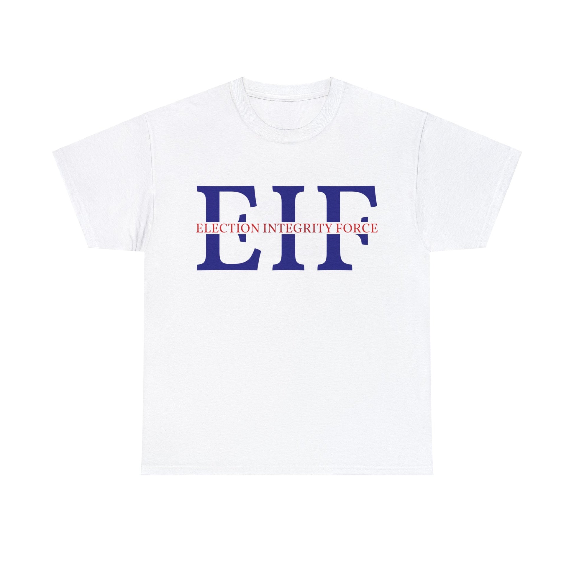 Front and center, the T-shirt features the striking "Election Integrity Force" emblem, symbolizing transparent and trusted elections. The emblem is surrounded by a circle of stars, representing unity and the democratic values that bind us together.